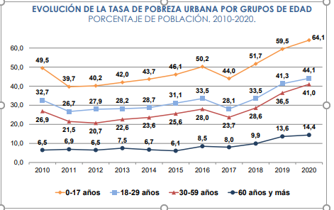 En el informe de la UCA se destaca que, para la población de niños y adolescentes, el registro de la pobreza alcanza a un 63% de los menores de 17 años. Es algo que compromete el futuro, ya que una población infantil y adolescente sin acceso a recursos adecuado para una buena nutrición afecta el normal desarrollo físico e intelectual. El tema resalta en el cuadro que sigue, agravado en este 2020, pero con arrastre de años donde la niñez resulta la más afectada en los registros de pobreza.